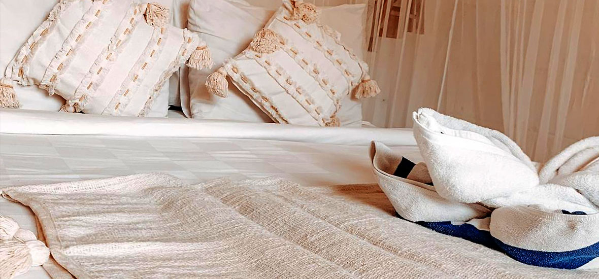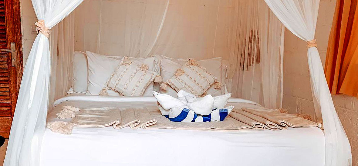 Step into this comfortably cooled suite equipped with mosquito nets for undisturbed rest and a secure personal safe for your valuables. Relax in the cozy seating area while enjoying serene garden views. Freshen up in the ensuite bathroom featuring a refreshing shower, complimentary toiletries, and a convenient hairdryer.